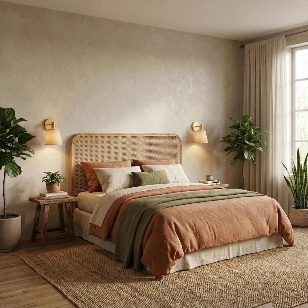 Para cabeceiras, utilize duas arandelas, uma de cada lado da cama, com lâmpadas LED 2700K ou 3000K para criar uma iluminação quente, relaxante e sofisticada.