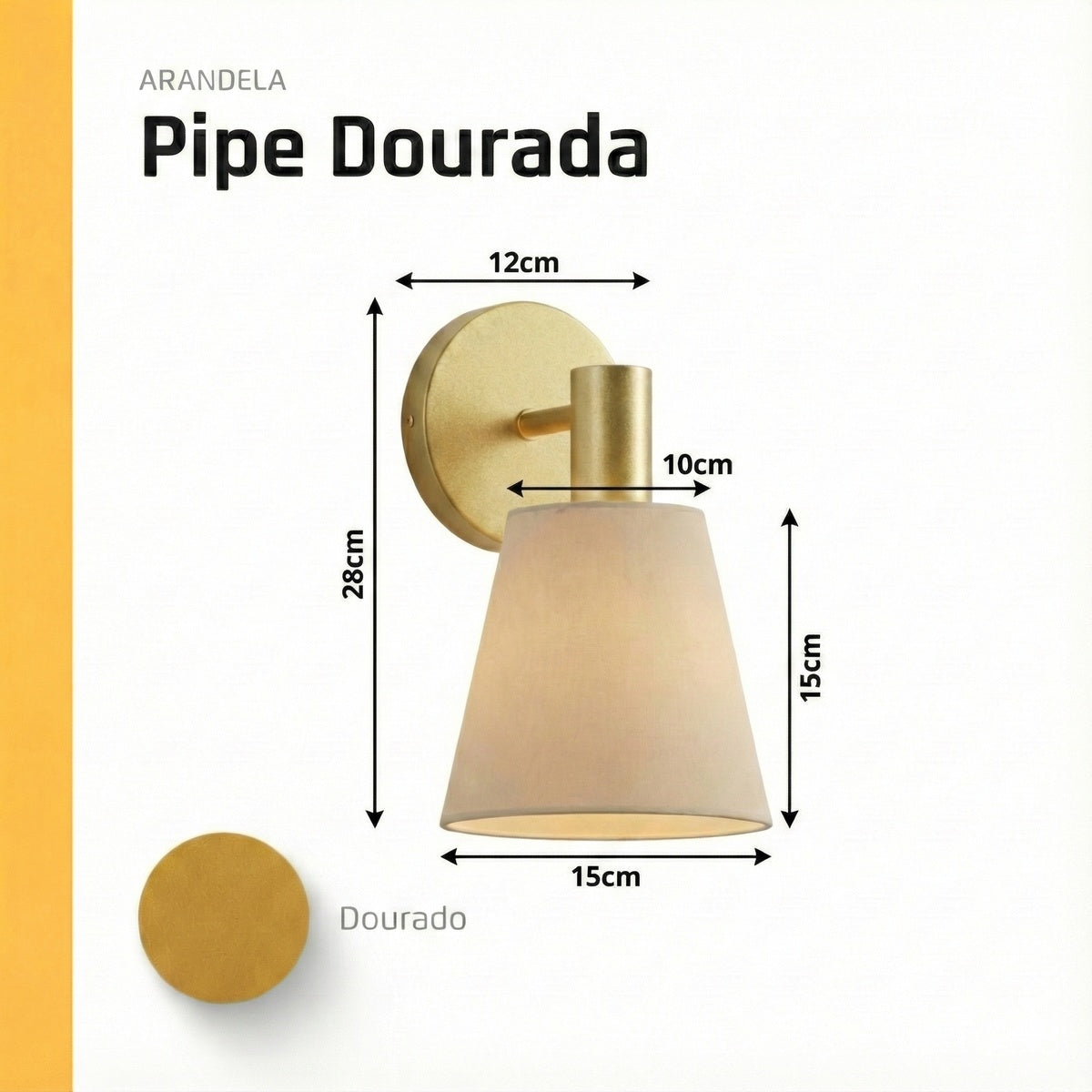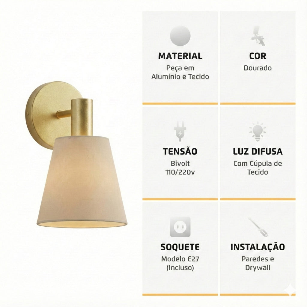 A Arandela de Parede com Cúpula Crua Bege Pipe Dourado Metalizado é a escolha ideal para quem busca iluminação decorativa, conforto visual e sofisticação. Seu design elegante combina a cúpula em tecido cru bege com estrutura em alumínio dourado metalizado, criando uma luz suave, aconchegante e extremamente agradável para ambientes residenciais.