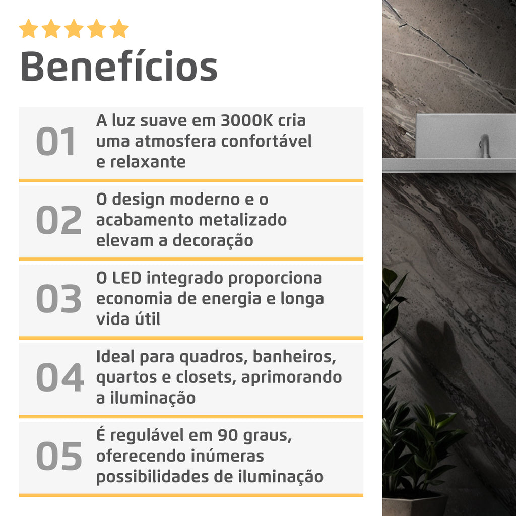 Posicione a arandela acima ou ao redor do espelho no banheiro, quarto ou closet para obter uma iluminação ideal durante a rotina de cuidados pessoais. A luz suave e direcionada destaca seu reflexo, tornando cada momento diário uma experiência iluminada e elegante.