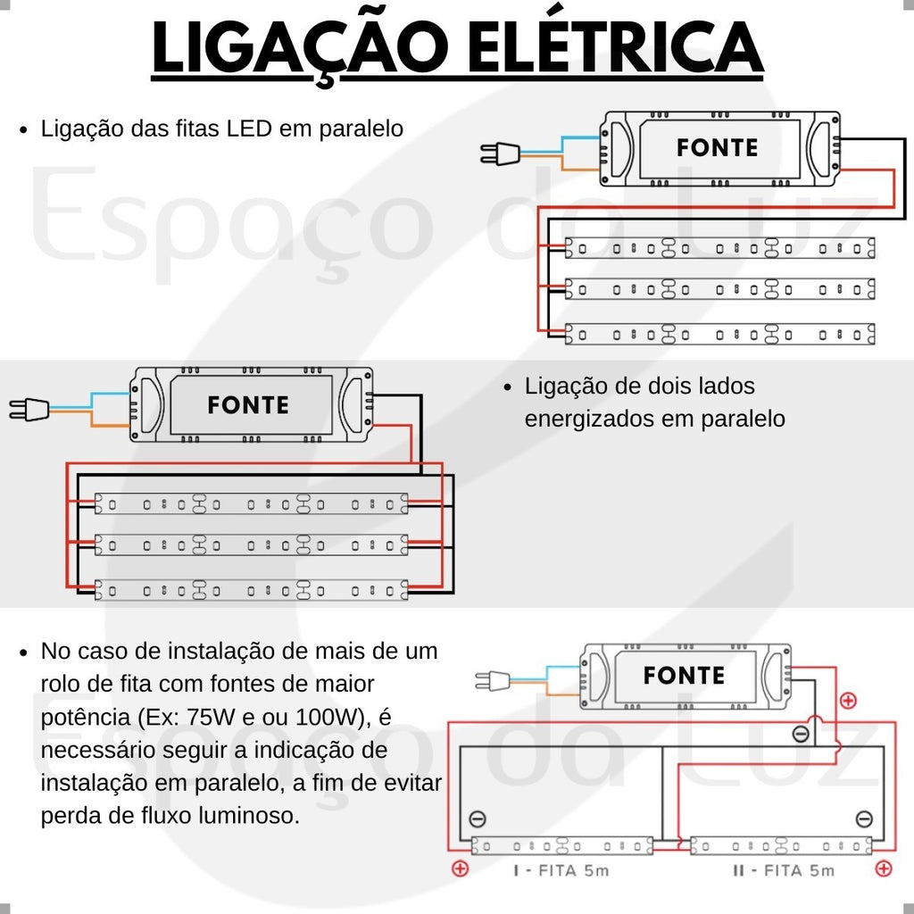 * Utilize uma fonte 12V Stella a cada cinco metros de fita, a fim de evitar perdas no fluxo luminoso.