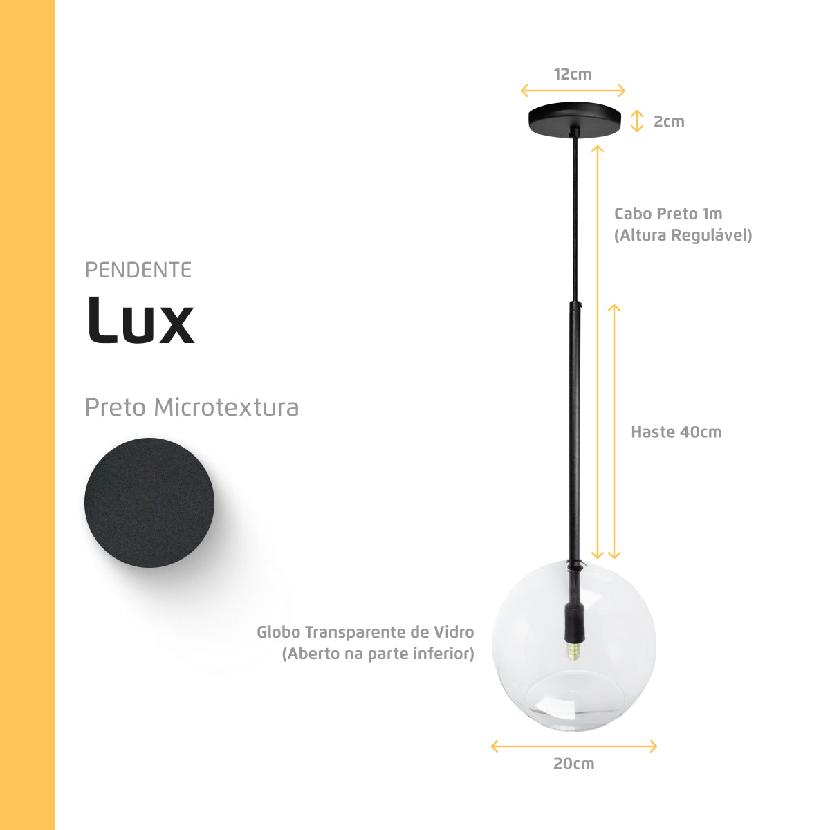 - Design Moderno e Sofisticado: O acabamento Preto e o globo de cristal transparente conferem requinte e se adaptam a diferentes estilos de decoração.